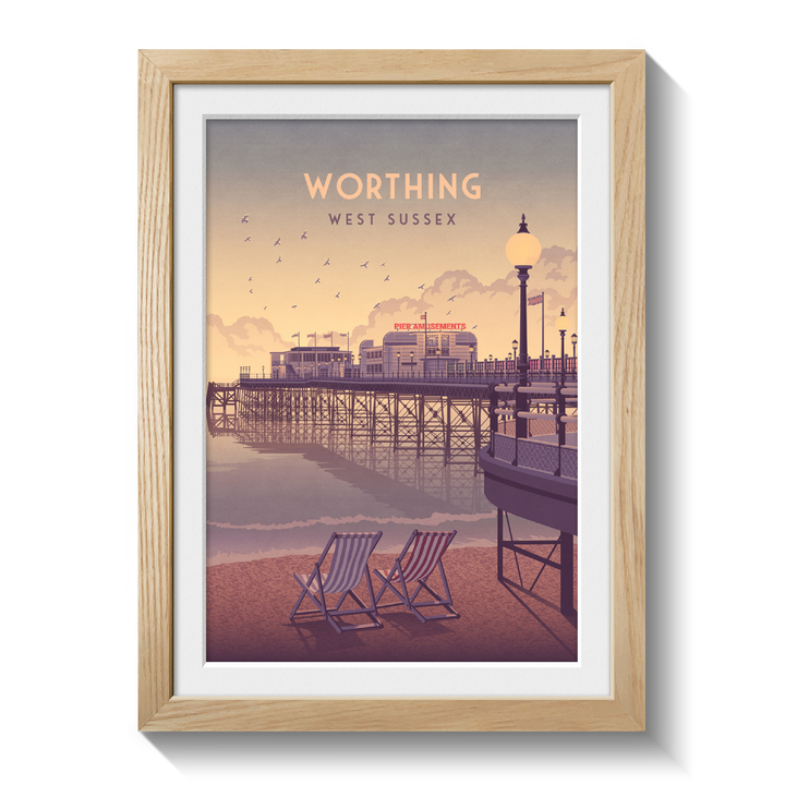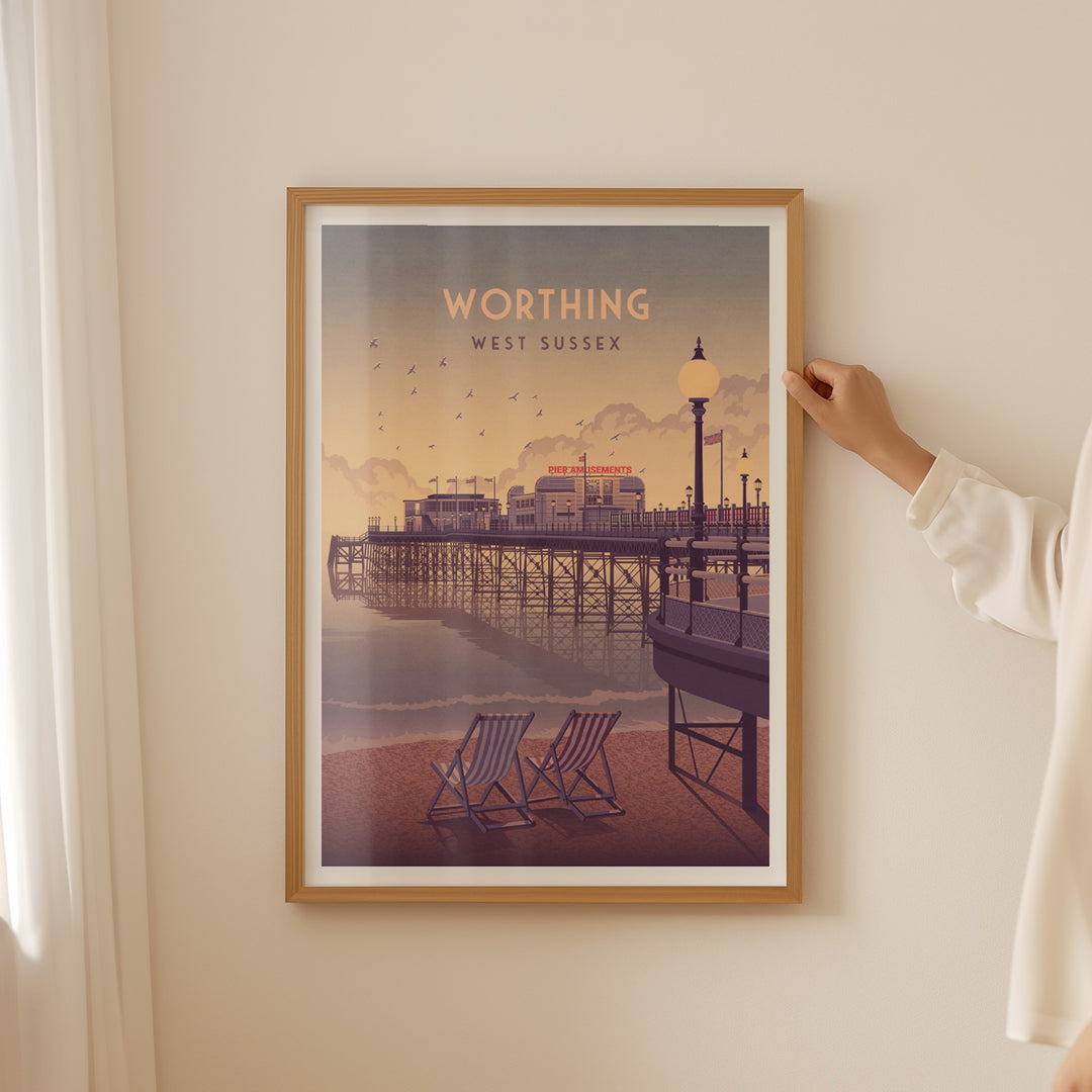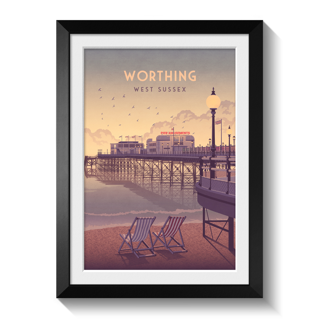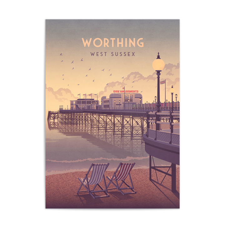An original travel poster featuring the beach and pier in Worthing. Worthing is situated in West Sussex at the foot of the South Downs National Park and 10 miles west of Brighton, it is one of the largest seaside towns on the south coast.