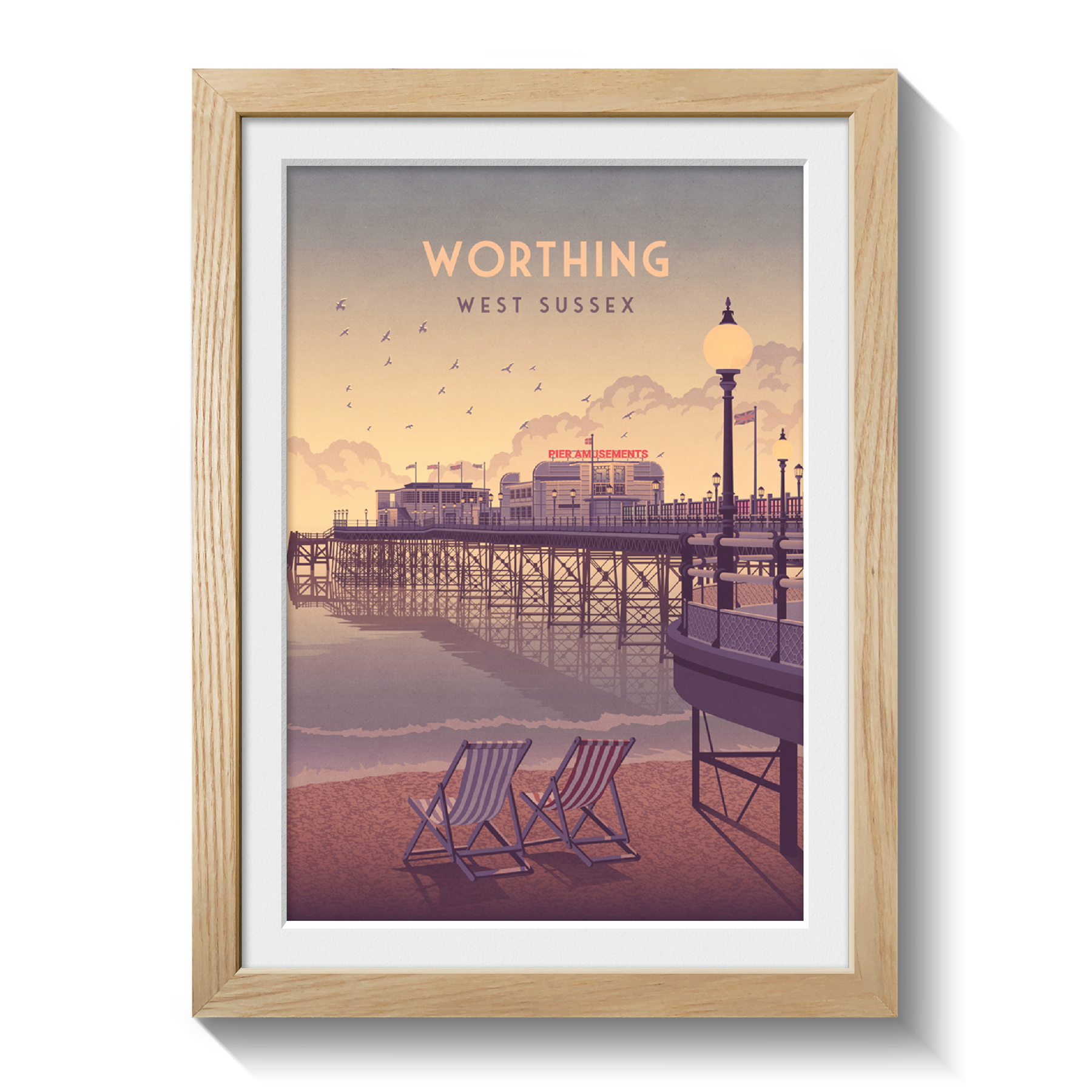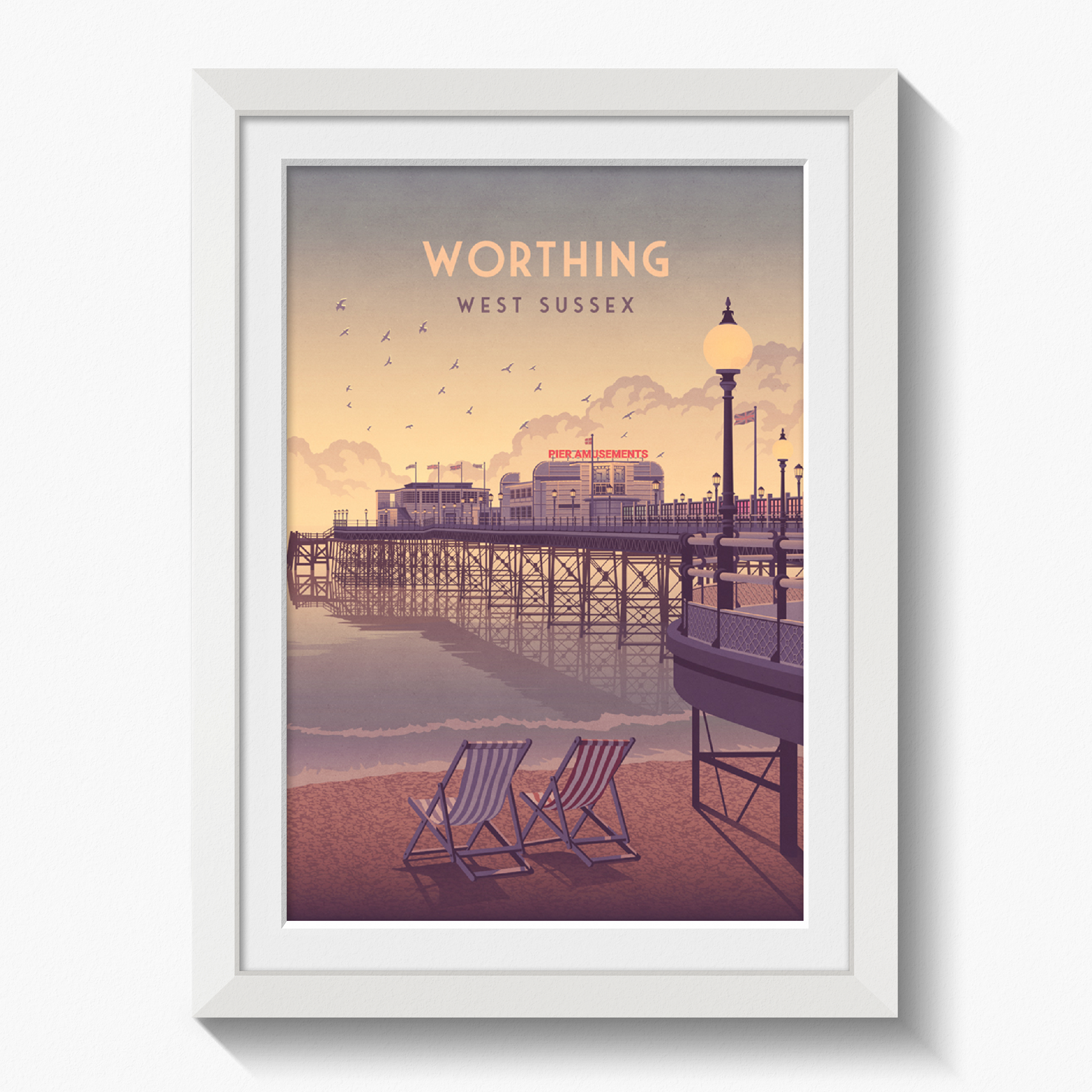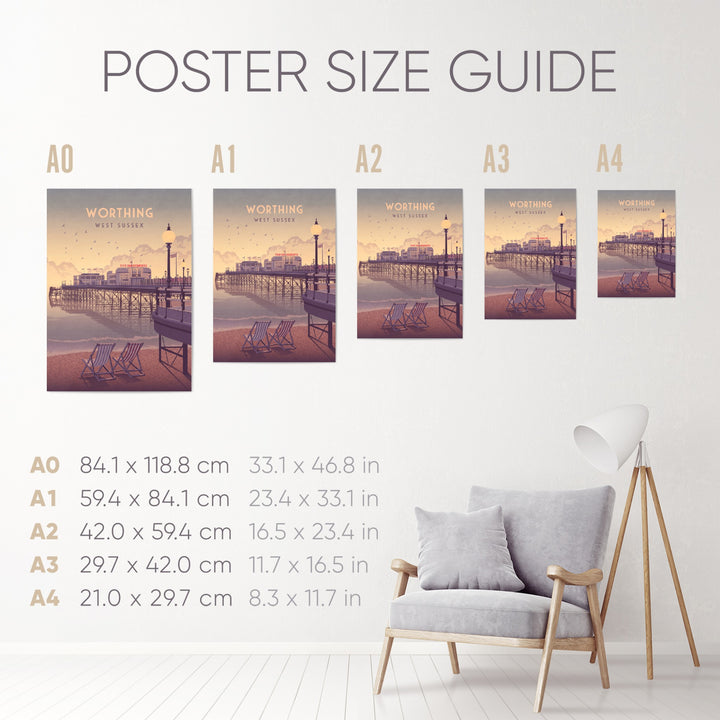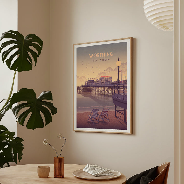 An original travel poster featuring the beach and pier in Worthing. Worthing is situated in West Sussex at the foot of the South Downs National Park and 10 miles west of Brighton, it is one of the largest seaside towns on the south coast.